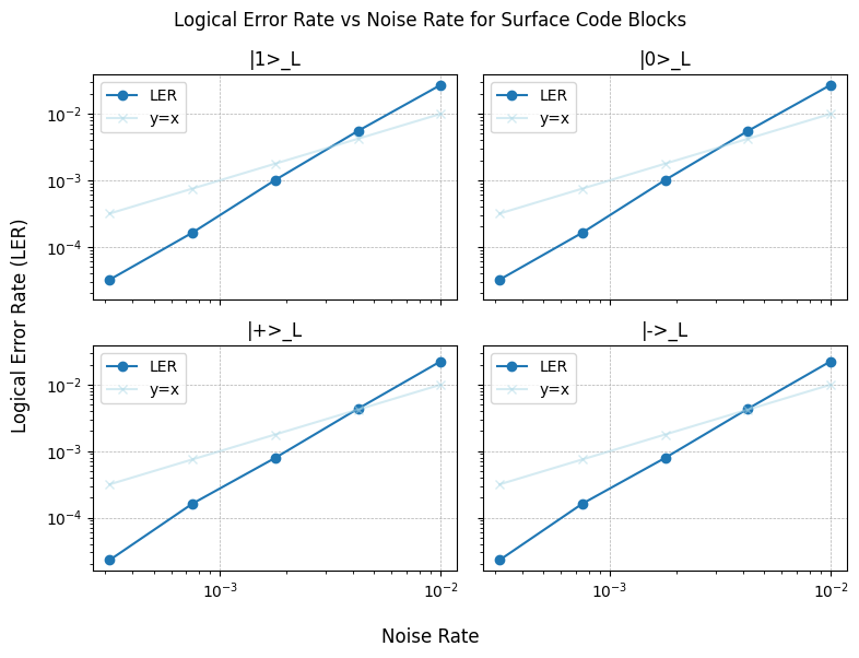 fig.suptitle("Logical Error Rate vs Noise Rate for Surface Code Blocks")